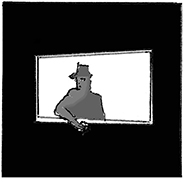 mörkt rum, motsvarande döden. Han sitter